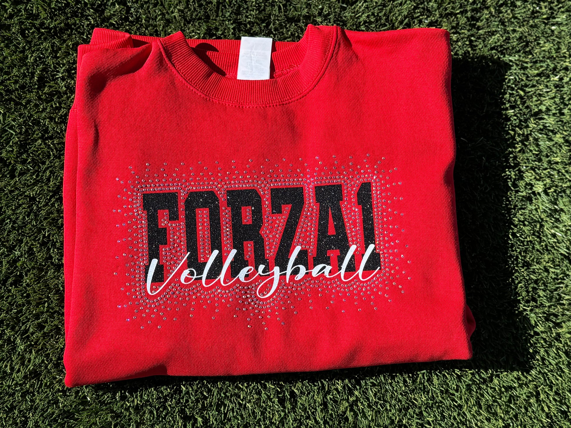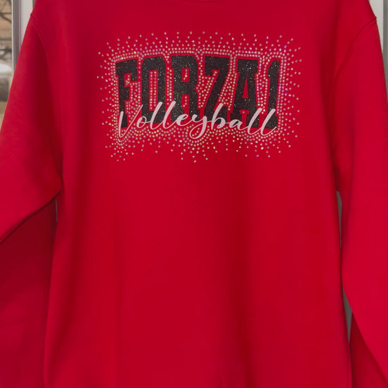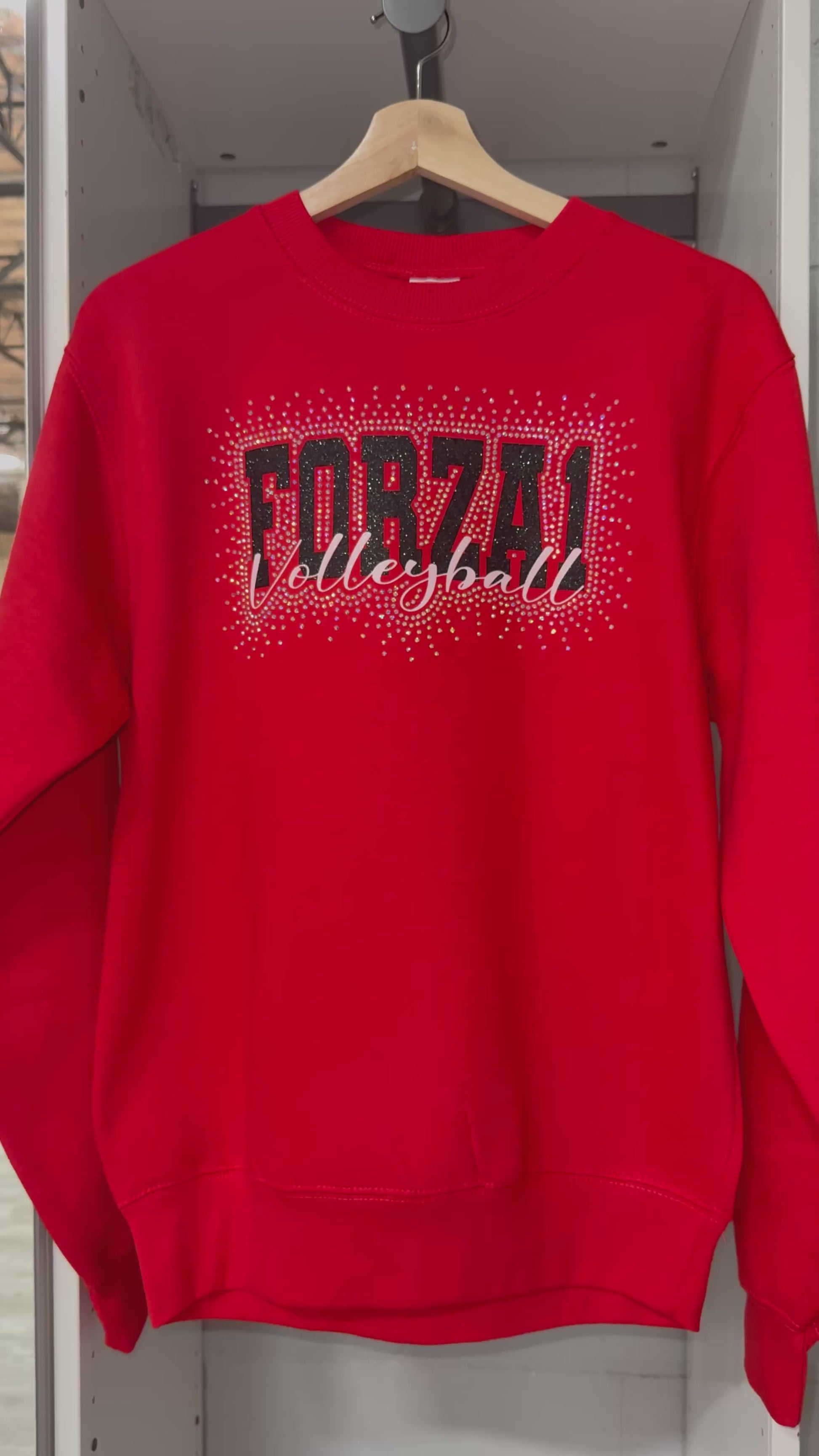 Red Forza1 crew neck with rhinestone detailing. Sizes S-XXL are crew necks while YL and YXL are hoodie versions.